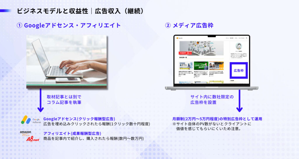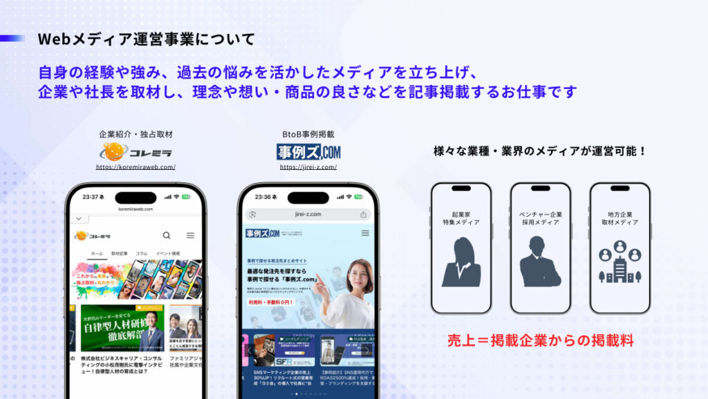 Webメディアを自ら運営し、企業や経営者を取材してインタビュー記事の掲載を行うビジネスモデルです。