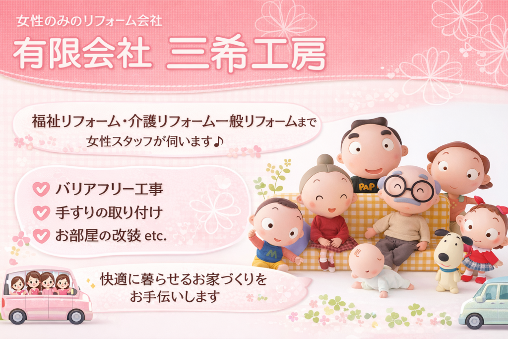 福祉リフォーム・介護リフォームから一般住宅リフォームまで対応する有限会社三希工房。高齢者やご家族が安心して暮らせる住まいづくりを経験豊富なスタッフがサポートします。